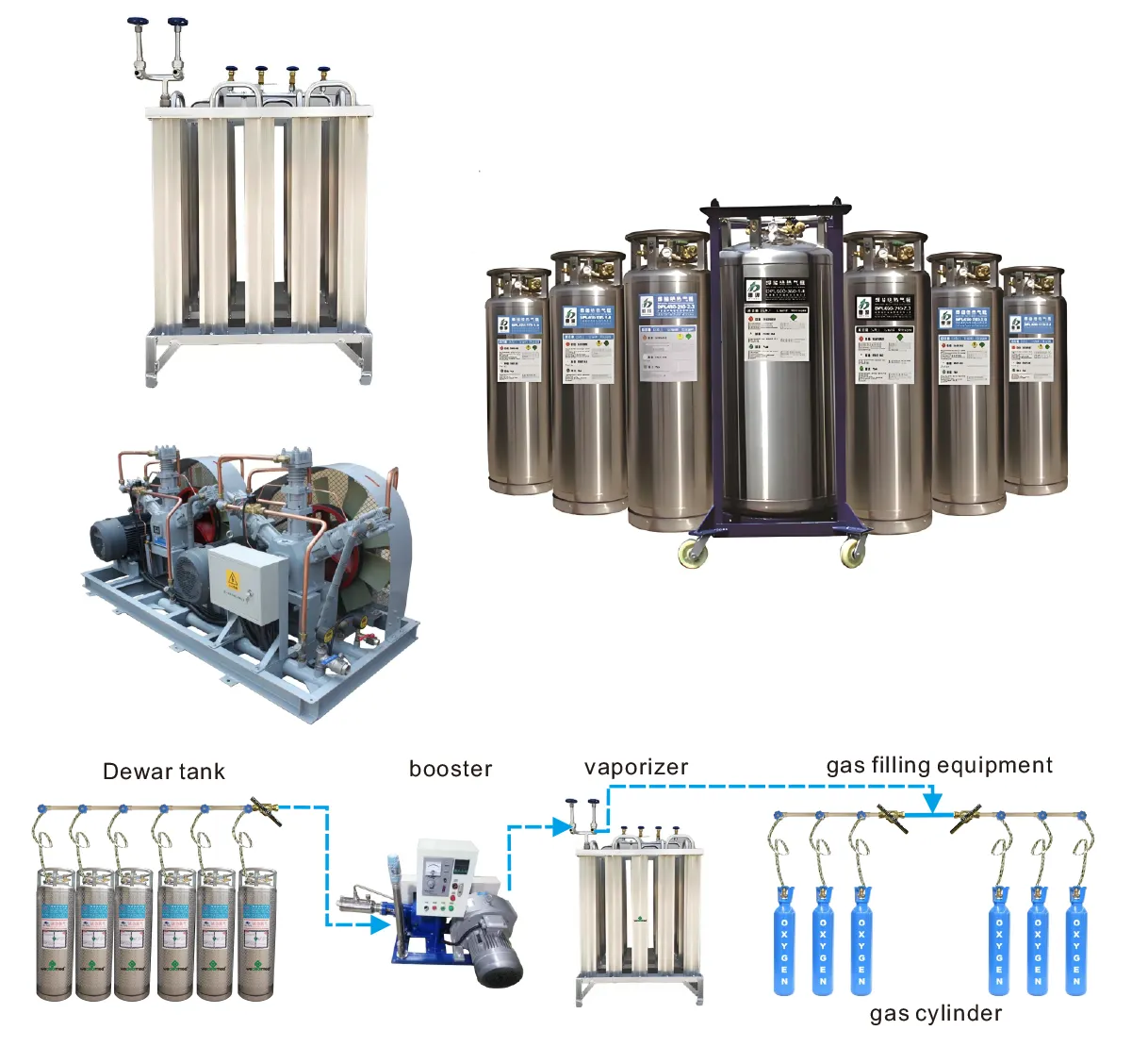 Det medicinske flydende iltsystem bruges til produktion, opbevaring og transport af væsker med lav temperatur. Det er vidt brugt i medicinske, industrielle, landbrugs-, nationale forsvars- og videnskabelige forskningsindustrier. Sammenlignet med den traditionelle stålgascylinder har den fordelene ved praktisk transport, energibesparende, sikkerhed og pålidelighed.